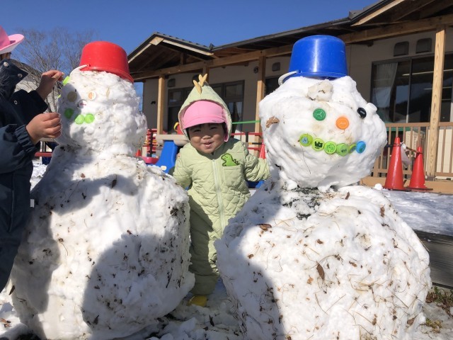 園庭に雪が降り積もり、「ゆっきー♪」と大喜びの子ども達。お兄さんお姉さんが園庭のビオトープから取った大きな氷に目を丸くし、持ち上げることに挑戦したり、先生と一緒に大きな雪だるまを作ったりと、冬の自然の面白さと楽しさを味わっています。冷たい風が吹いても、手が冷たくなっても、寒さなんてなんのその。「もっと遊びたい!」と元気に戸外で遊んでいます。
