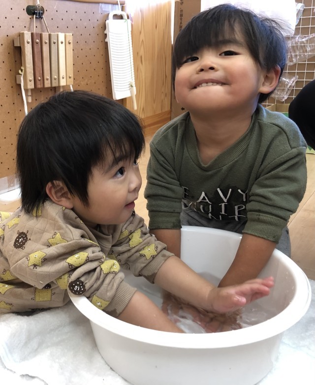 たっぷり遊んで冷たくなった手は、“お手々温泉“で温めます。お湯に手をつけた瞬間、友達や先生と顔を見合わせ、「あったかいねぇ~」と体も表情もほっこりする子ども達でした。