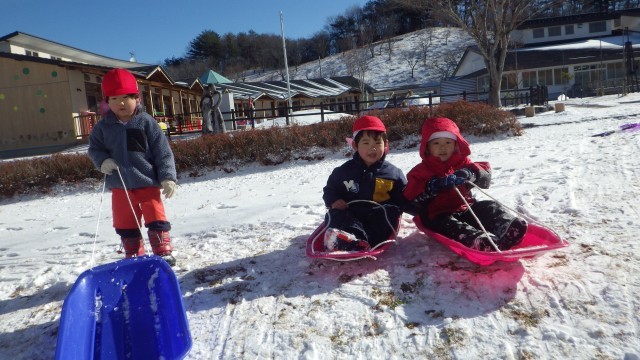 そり滑りは、スピードとスリルを味わおうと、小高い所から一気に滑り、何度も繰り返して遊んでいます。また、新雪を集めて「わたあめみたい」「つめたいわたあめ」「食べられないよ」などと子ども同士で話しています。