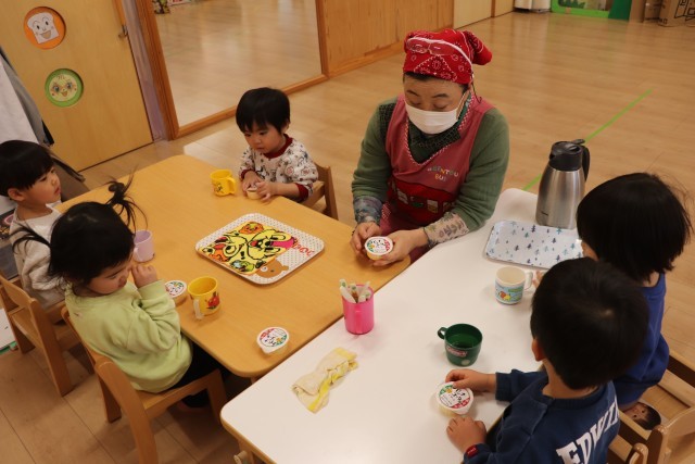 2月4日、午後のおやつにイタリアで開催される冬季オリンピックにちなんだ「パンナコッタ」(イタリア発祥のデザートで、生クリームを煮たという意味を持つスイーツ)を提供しました。容器のフタには、イタリア国旗が描かれており、子ども達に「どこの国の旗かな?」と聞きましたが残念ながら当てられる子はいませんでした。オリンピックが始まると、TVでたくさんのイタリア国旗が観られるのでお家の人にも教えてね、と話しながらおいしくいただきました。