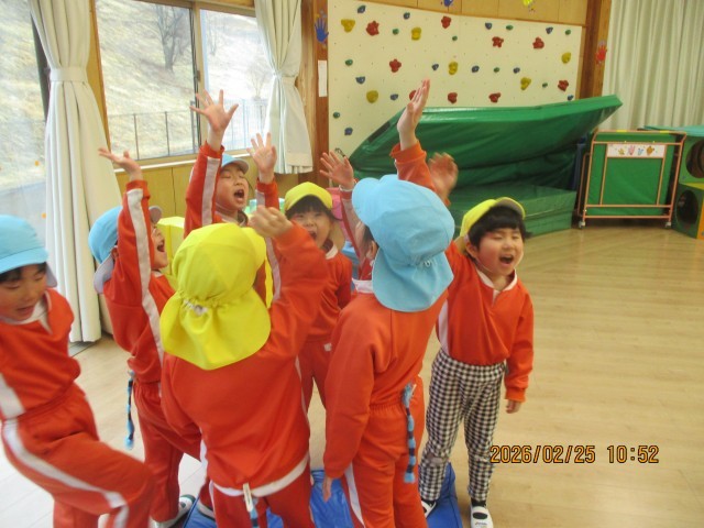 つき組の子ども達は、そら組さんとの集団遊びが大好きです。一緒に過ごす時間が増え、そら組さんからたくさんの刺激やパワーをもらい、憧れやありがとうの気持ちが膨らんでいます。