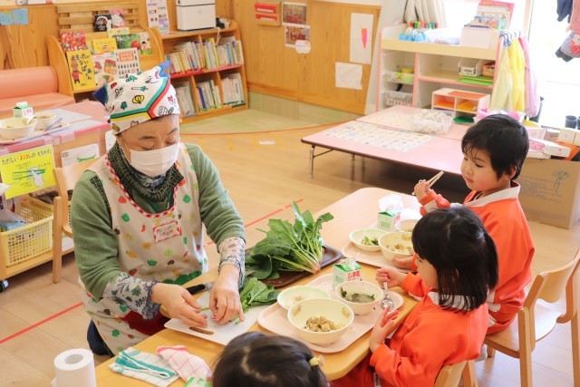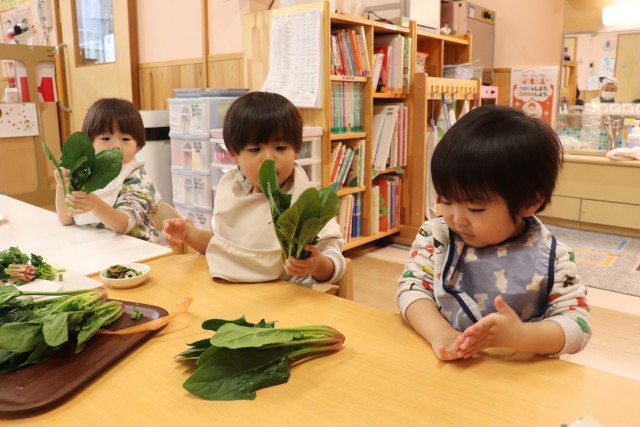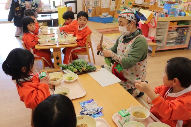 2月18日、未満児と以上児の給食にほうれん草が入ったメニューが提供されたので、今が旬のほうれん草を紹介しました。緑色の葉と茎が赤いのはほうれん草の特徴であることや、血液にパワーをくれる鉄分がたくさんあることを伝えました。ほうれん草は前に話をした三つの栄養の1つ、キラキラグリーンに含まれ、チャンピオン級の栄養があることを伝えると、葉を手に取り、匂いを嗅いで何故か「シャインマスカットの香りがする~」と言う子もおり、楽しく紹介することができました。