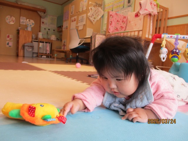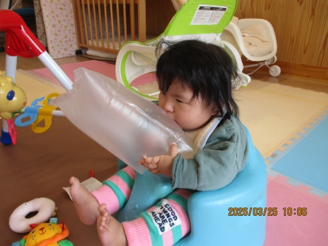 最近は寝返りができるようになり、腹這いになると近くにある玩具に手を伸ばして掴んだり、舐めたりして感触を楽しんでいます。特にビニール袋のをバンボに座って「カシャカシャ」の音をさせながら夢中で遊んでいます。