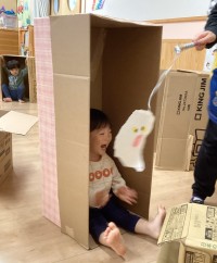 つぼみ組の子ども達はかくれんぼが大好き。お部屋では段ボール、外では大きな石など、...