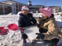 園庭に雪が降り積もり、「ゆっきー♪」と大喜びの子ども達。お兄さんお姉さんが園庭の...